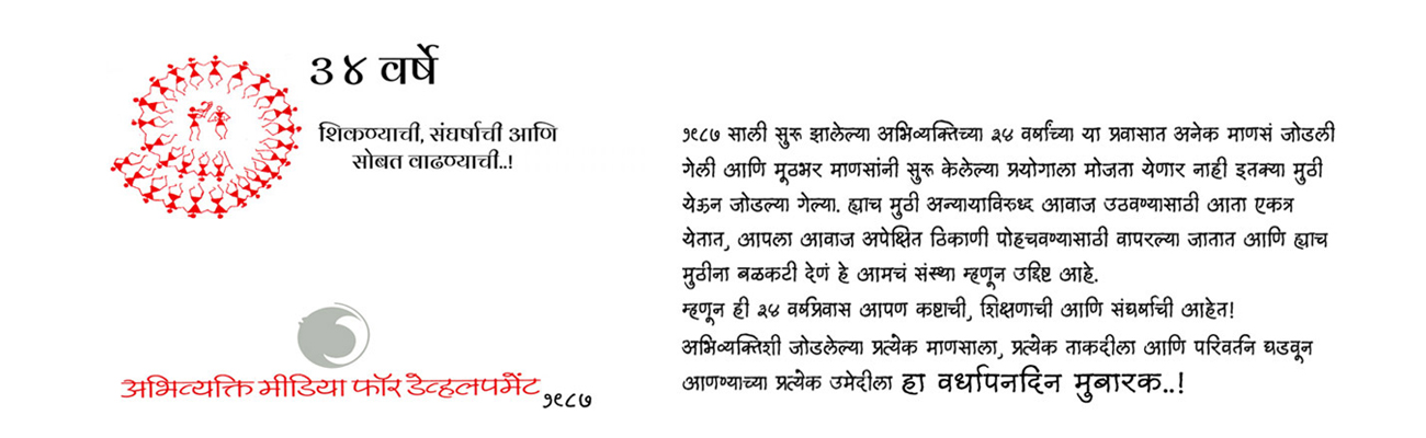 Abhivyakti believes that critical and creative communities are possible to challenge the hegemony of the singular world-view. Abhivyakti works to strengthen the processes that develop, enhance and deepen the emergence of critical and creative communities at the grassroots and which rejuvenate grassroots leadership, democracy and social justice.